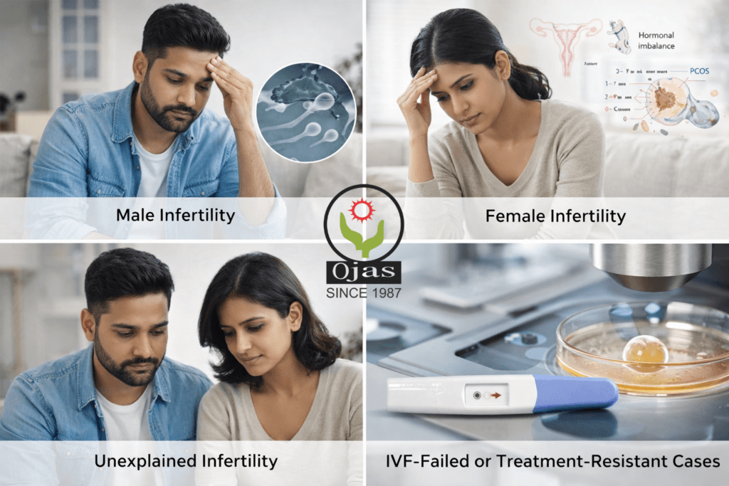 - Female infertility (PCOS, hormonal imbalance, cycle irregularities)